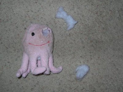 My sister's dog destroyed this happy stuffed baby octopus. Yet he remained incredibly happy.